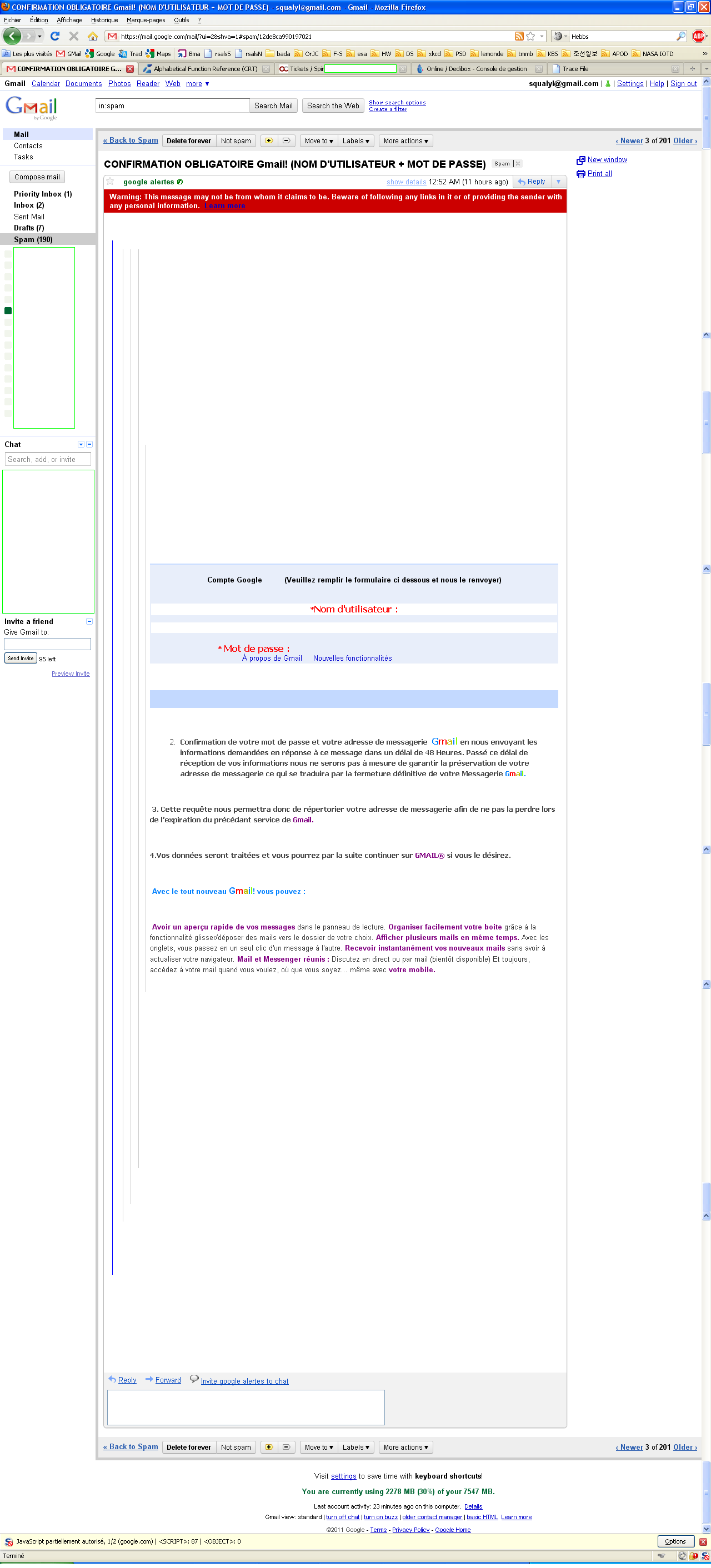 - La réception de ces Courriels a votre adresse entraine des perturbations sur tous le réseau des utilisateurs du service de messagerie de Google Mail Gmail® .