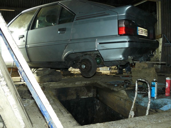 deux petites photos de l'atelier avec sa fosse (cresé à la main par mon père !). c'était en décembre dernier pour le changement