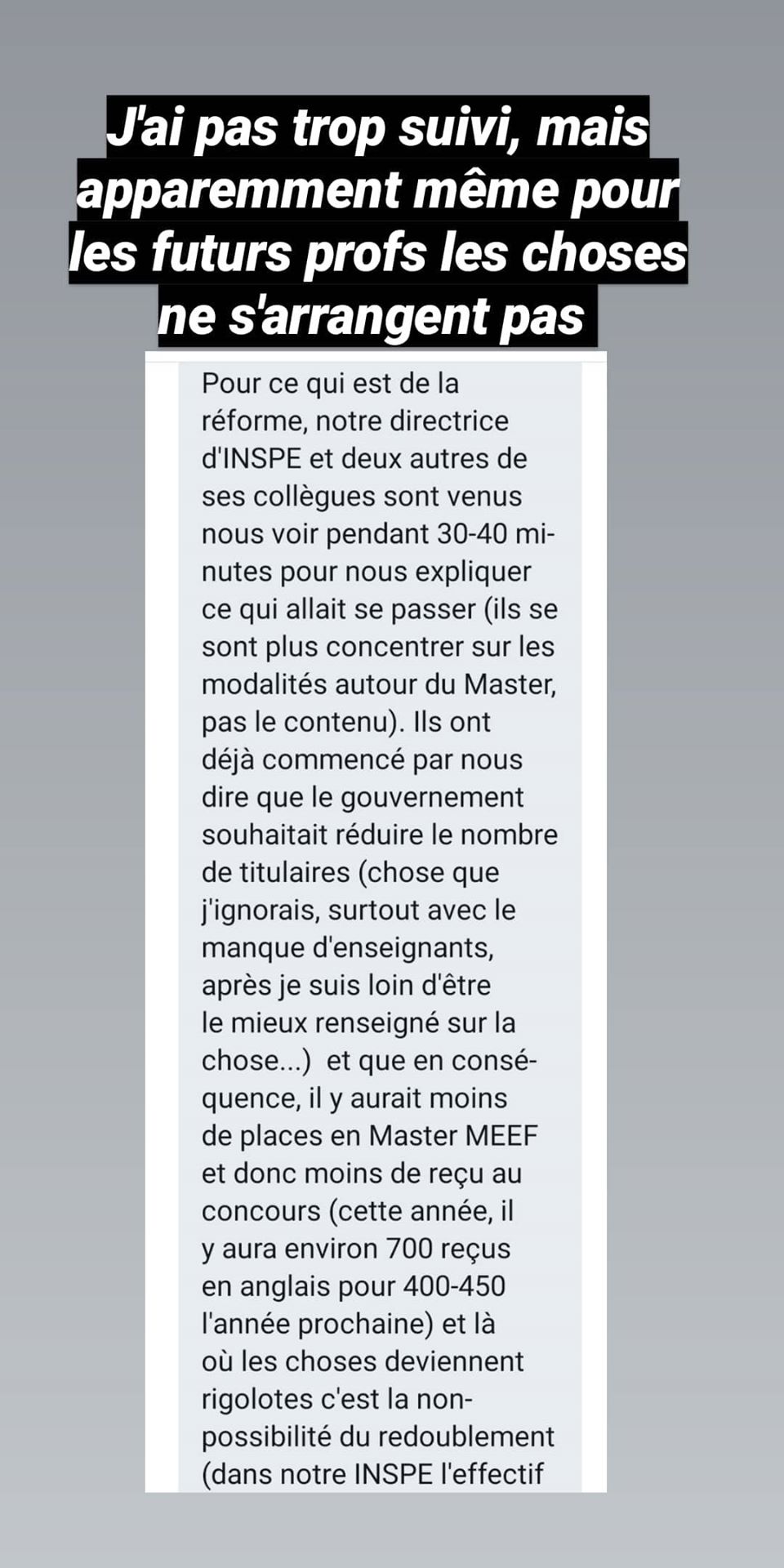 Franchement j'aimerais autant pas, mais j'ai une poignée d'élèves (surtout les handicapés) que je me retrouverais à de facto abandonner sur le bas-côté et ça quelque part ça me plaît pas.
