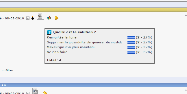 J'ai voté pour la 1ère et la 3ème solution, les 2 sont acceptables (MakePrgm est totalement obsolète: pas de gestion du COFF, pas de linking entre plusieurs fichiers etc.). En revanche, ne rien faire est certainement la mauvaise réponse et "Supprimer la possibilité de générer du nostub", certes, visiblement personne ne l'a utilisée, du moins avec un programme qui contient des relogements, mais ça rendrait MakePrgm encore plus obsolète et inutile et ce serait plus de travail que de corriger le problème.