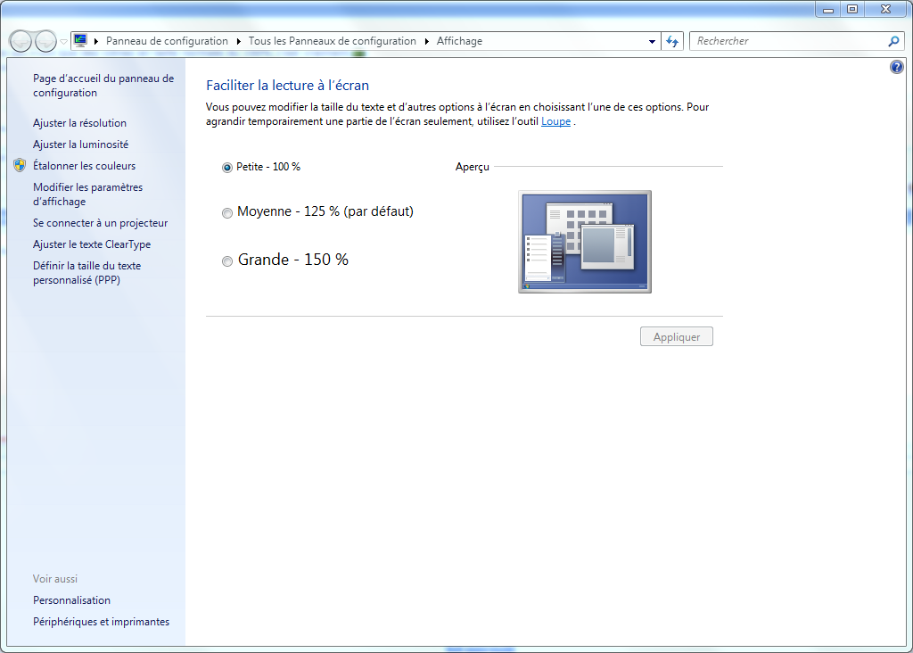 RHJPP Le 22/02/2010 à 23:16 Je n'ai jamais essayé, j’utilise toujours la taille 100 %. Mais je pense qu'on ne fait qu'un seul réglage pour tous les écrans. Ça doit éviter de faire des zooms différents pour un même élément lorsqu'il se trouve en partie sur deux écrans simultanément...