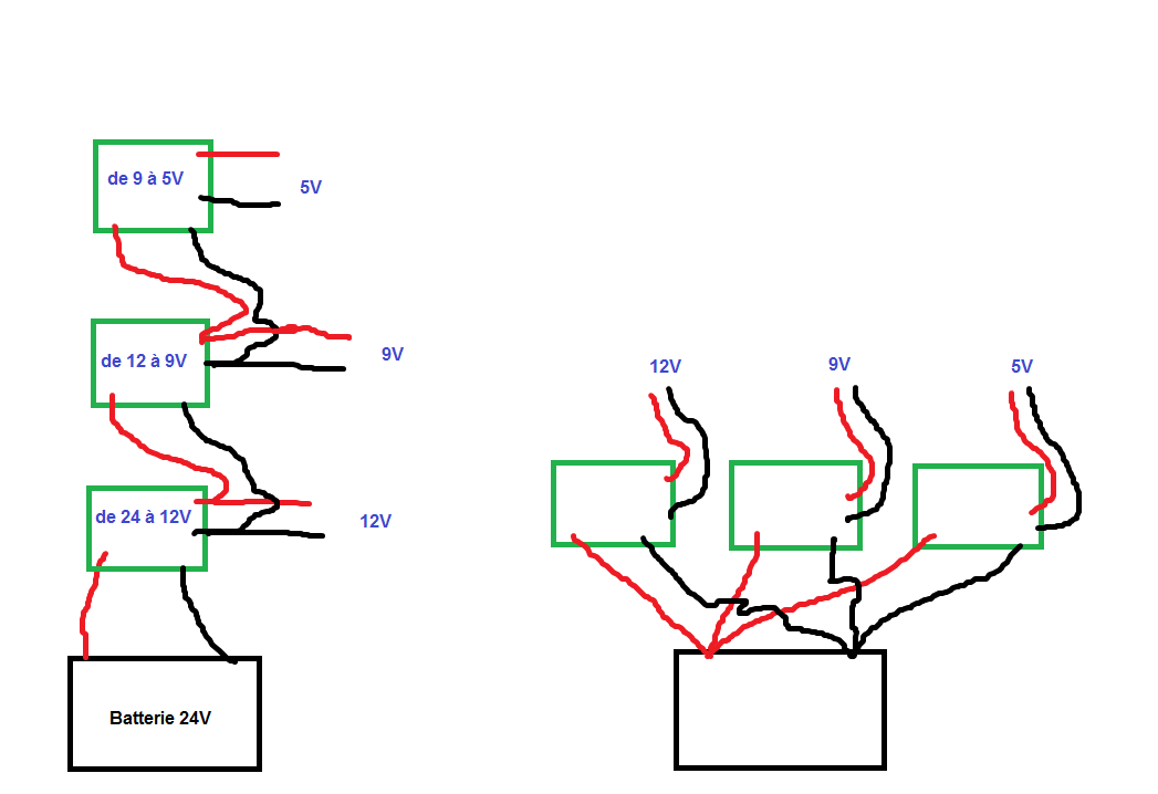 En plus avec le montage de gauche, le régulateur 12V va douiller vu qu'il doit sortir le jus pour tout le monde, alors qu'a droite ce n'est pas le cas.