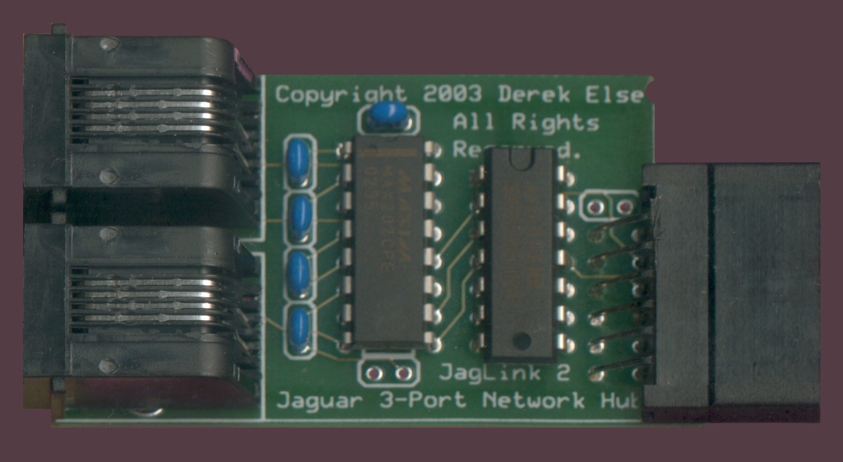 C'est ça : contrairement au JagLink "classique" qui n'a qu'un seul connecteur RJ11 et qui est limité à deux consoles (c'est un simple convertisseur TTL - RS232, sans logique en plus), avec le JagLink II on peut chaîner autant de consoles qu'on veut (un connecteur RJ11 est connecté à la console "précédente", l'autre à la console "suivante").