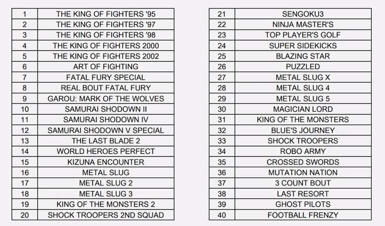 Fichier joint : Les 40 jeux (non confirmés SNK) dans la bête :