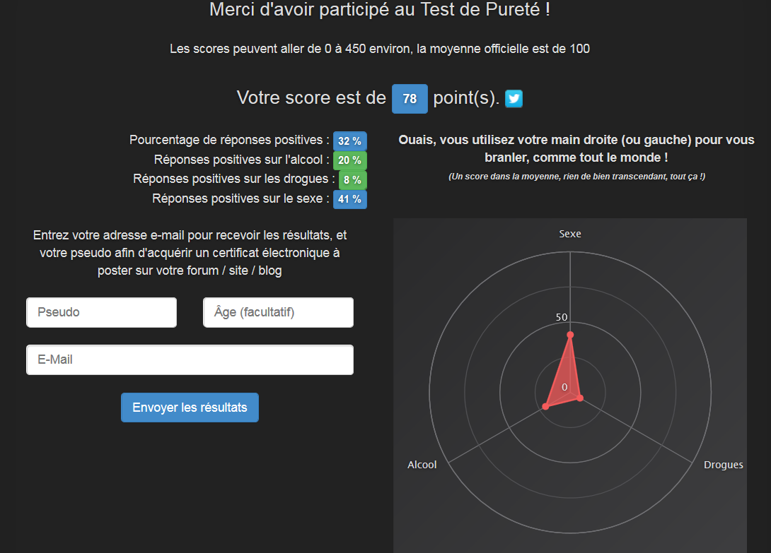 En refaisant le test j'ai eu un score inférieur grin 145 points. Faut dire, y a des questions un peu ambiguës et des questions concernant des habitudes saisonnières (qui partent et reviennent) genre "buvez-vous de l'alcool au moins 3x/semaine".