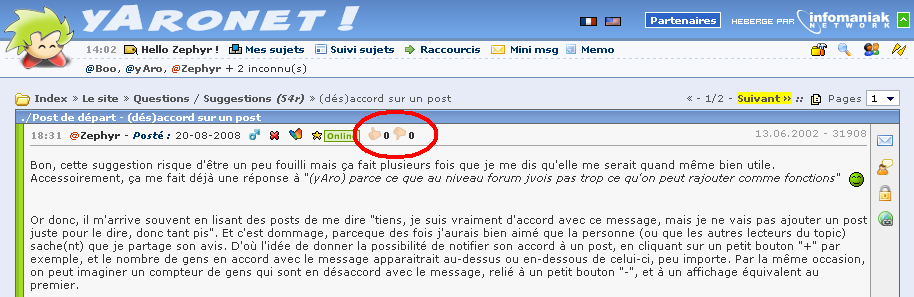 L'idée est d'avoir un indicateur de l'avis des yNautes à propos d'un post sans pour autant surcharger les topics avec des suites de "#crayon#", vous pouvez donc pour chaque post exprimer votre (dés)accord. Le nombre de personnes ayant voté à propos d'un post est affiché à coté des boutons de vote, et vous pouvez voir la liste des gens qui se sont exprimés en cliquant sur ces mêmes boutons.