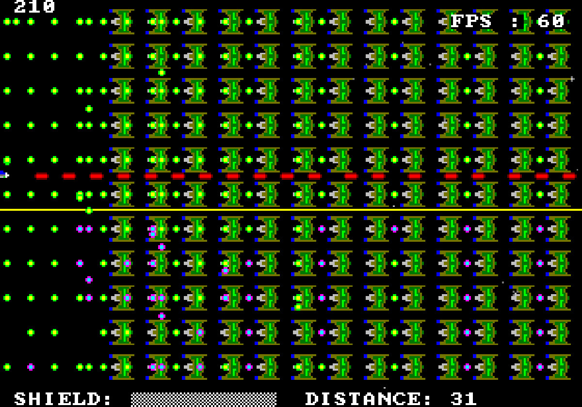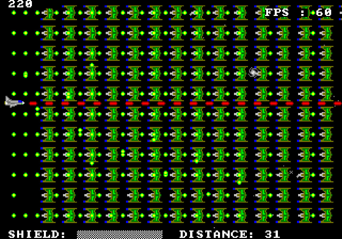 The game has 32 background sprites, 21 player bullets, 155 enemies, 170 enemy bullets and 2 player ship sprites (nose + tail stuck together) all at once = 380 sprites