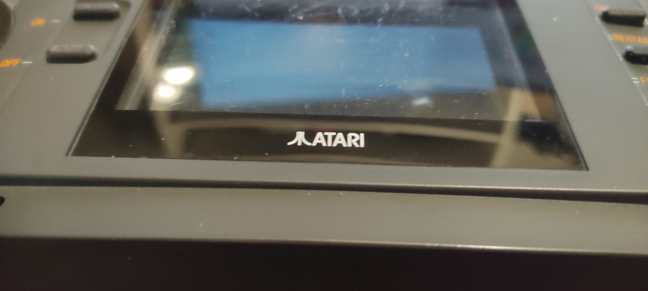 La vitre écran n'est pas nickel, en particulier un petit accroc blanc en bas qui ne se voit pas en jeu. Pour information, RetroSix vendait des vitres de remplacement il y a quelques années, ils sont sold out et je n'en ai plus en stock.