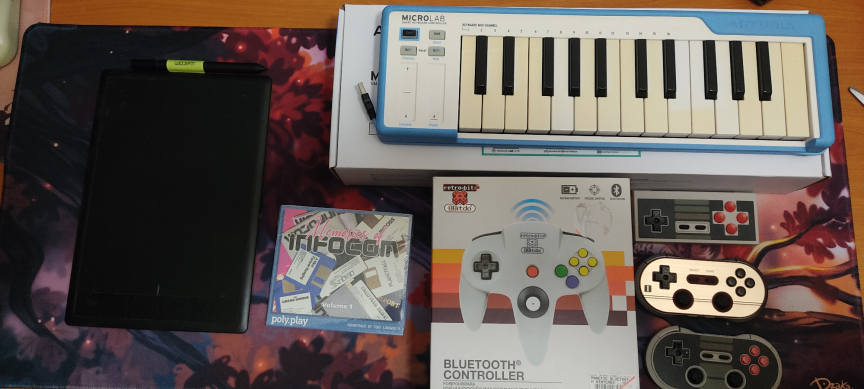 - Arturia Microlab (un truc pour appuyer sur des touches - jaunies - et ça fait croire qu'on joue de la musique si on le branche en USB à un ordinateur) : 25€