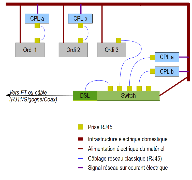 - Le CPL a des avantages et des inconvénients sur le Wifi : meilleur débit, pas d'ondes propagées chez toi. Par contre, il est onéreux (pour relier un appareil à ton routeur ou ton switch, il te faut deux boitiers), propice aux perturbations électriques, et s'il n'y a pas de cryptage entre les deux boitiers, il peut y avoir des fuites d'informations entre appartements, dans certains immeubles qui ont un réseau électrique assez mauvais.