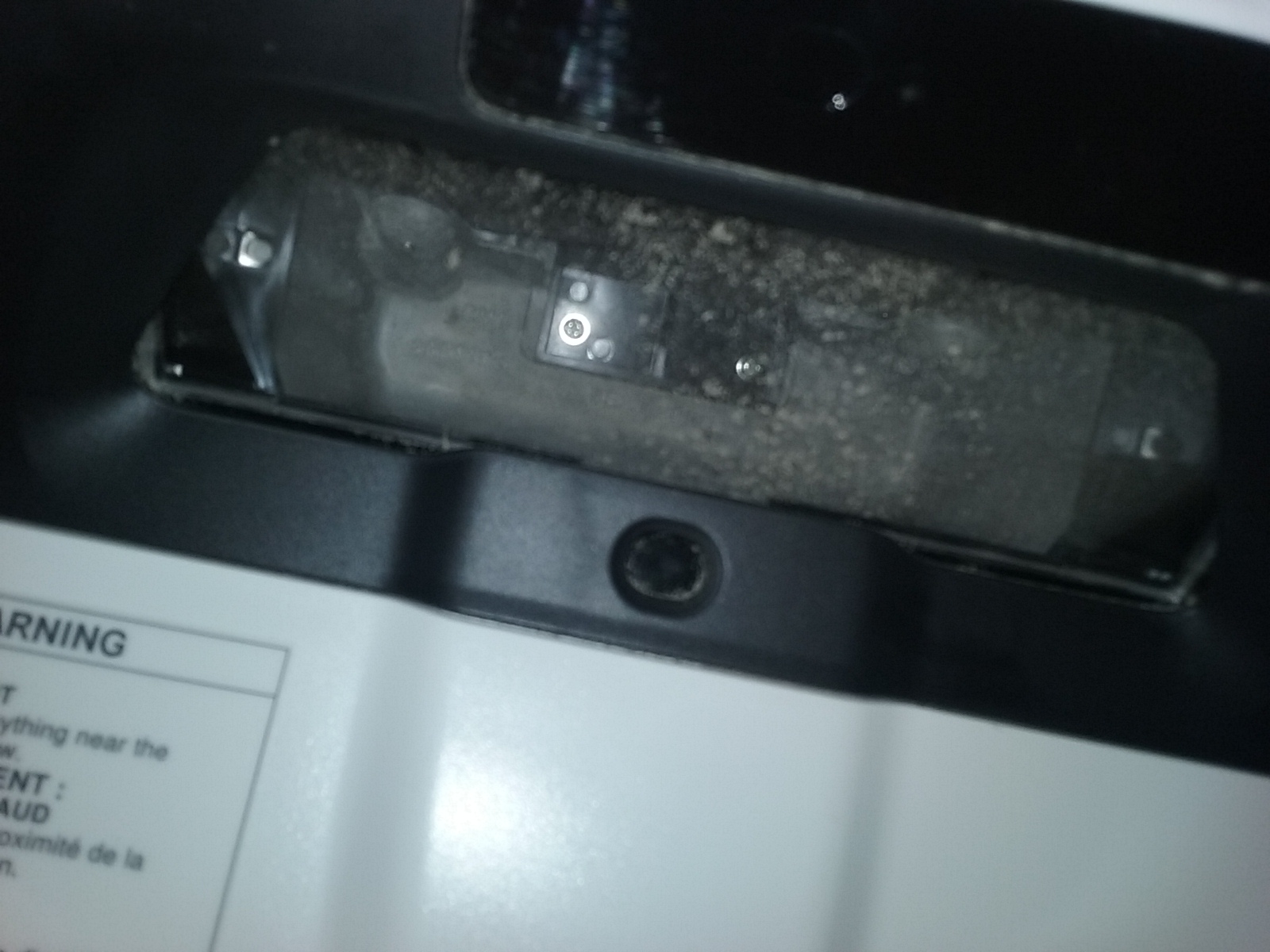 Celui ci présente des tâches "jaunâtres" anormales au niveau d'une des vitres > celle de gauche c'est le faisceau lumineux, celle de droite doit correspond à la réception interactive, mais il y a de la poussière qui semble s'y être accumulé (désolé le photo n'est pas terrible...)