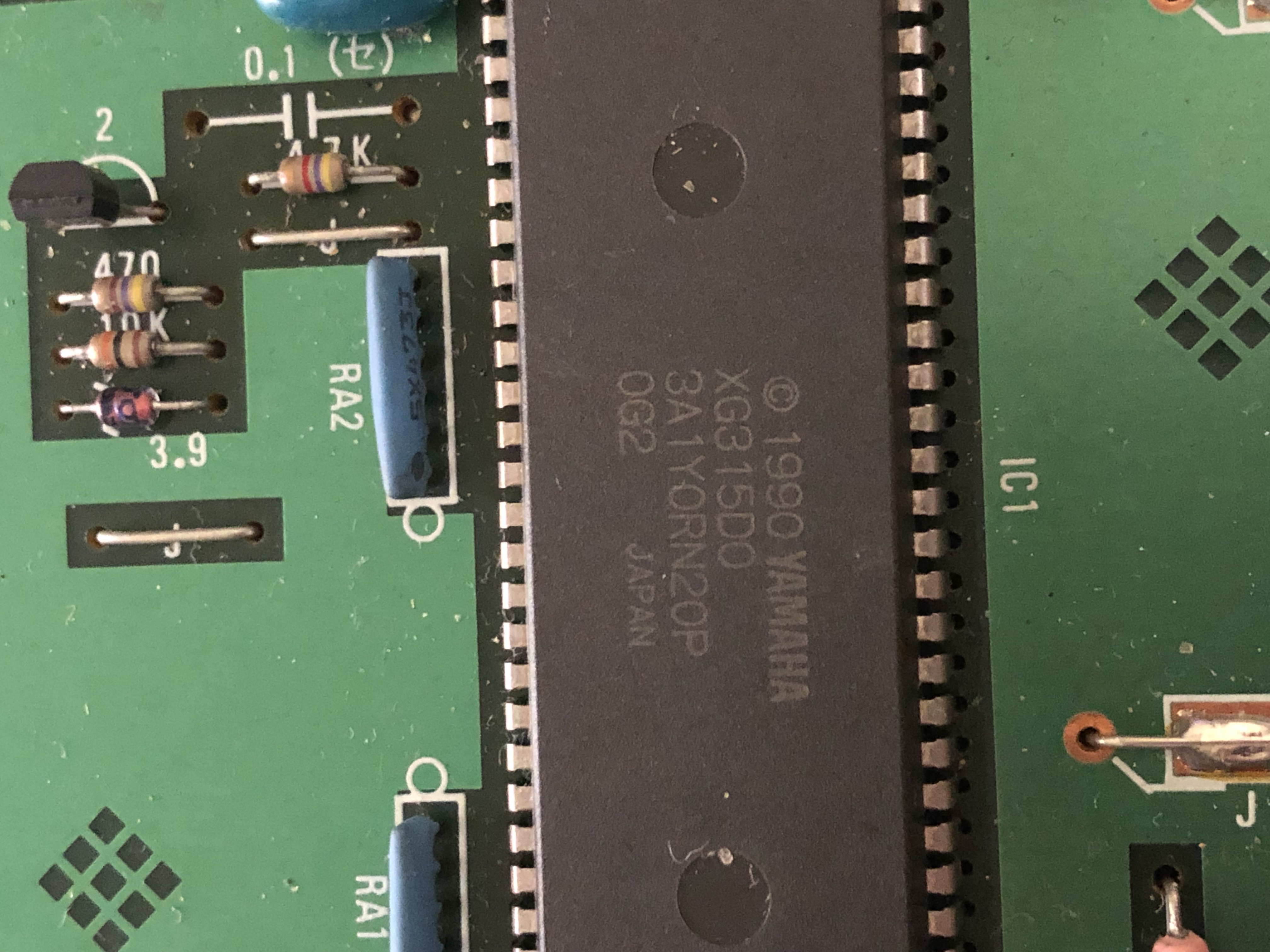 Bingo le truc bleu est un oscillo, j'ai ça sur un aspirateur autonome de Samsung. Mon Yamha DX7 et TX7 ont un crystal en boitier metal par contre