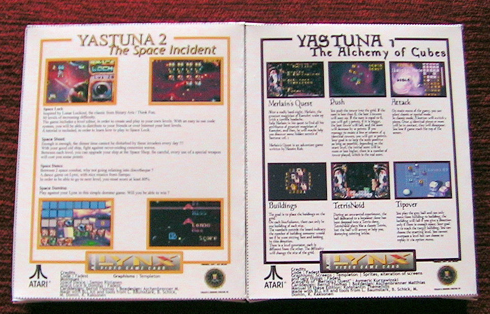 Fichier joint : Le travail réaliser par Bernd est vraiment impressionnant, les cartouches avec ces PCB rouge sont superbes, les boites sont imprimées sur du papier photo et font exactement la taille des boites d’origines, les manuels sont en couleurs et de qualité professionnelle quand au boite bleues elles contiennent en plus des jeux les fichiers « lisez-moi » des archives fournies pas Fadest ,un mode d’emploi en français ainsi qu’une petite mise en garde sur le disfonctionnement du jeu merlin sur les Lynx I.