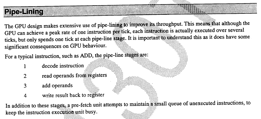 Donc pour moi au vu des timings de SCPD une chose semble clair : lorsque le GPU exécute du code en DRAM, le pipeline est complètement inhibé ! Prefetch compris ! Certes la DRAM est moins rapide que la local RAM, mais pas à ce point ! D'ailleurs, en FPM il ne faut que 2 cycles pour un accès sur une même page, et ça se voit clairement sur les diagrammes : que fait le GPU pendant 10 cycles entre 2 accès DRAM pour exécuter seulement 2 instructions !!?