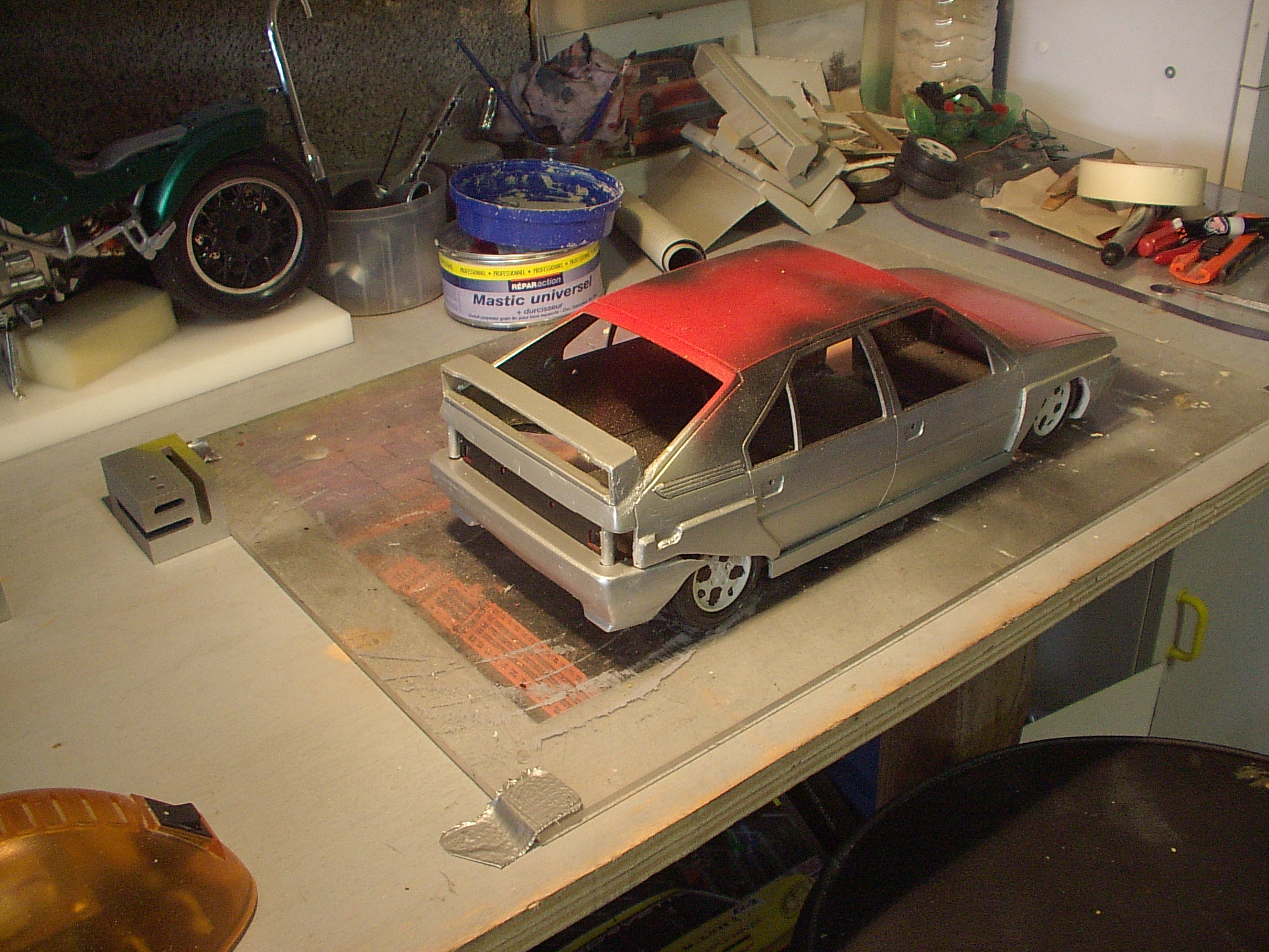 Pour les jantes c'est vrai qu'un moulage en silicone t'éviterait d'avoir à sculpter 4 jantes une par une: tu en sculptes une et tu la moule dans de la silicone pour pouvoir ensuite mouler les 3 autres jantes avec de la résine bi composant.