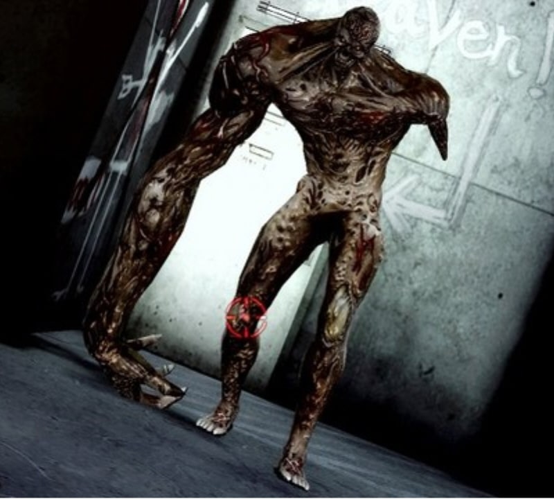 Le viseur de l'arme est pointé sur son genou.