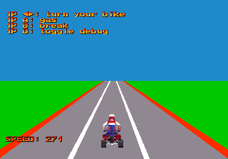 I already realized the start screen, the background music, and speed increasing and decreasing (don't be surprised because of racer sprite is not animated - all Four Trax sprites I found in the Internet just has one frame only), but this demo is still lacks of scaling objects at the racer's way, and also road markings and curves.