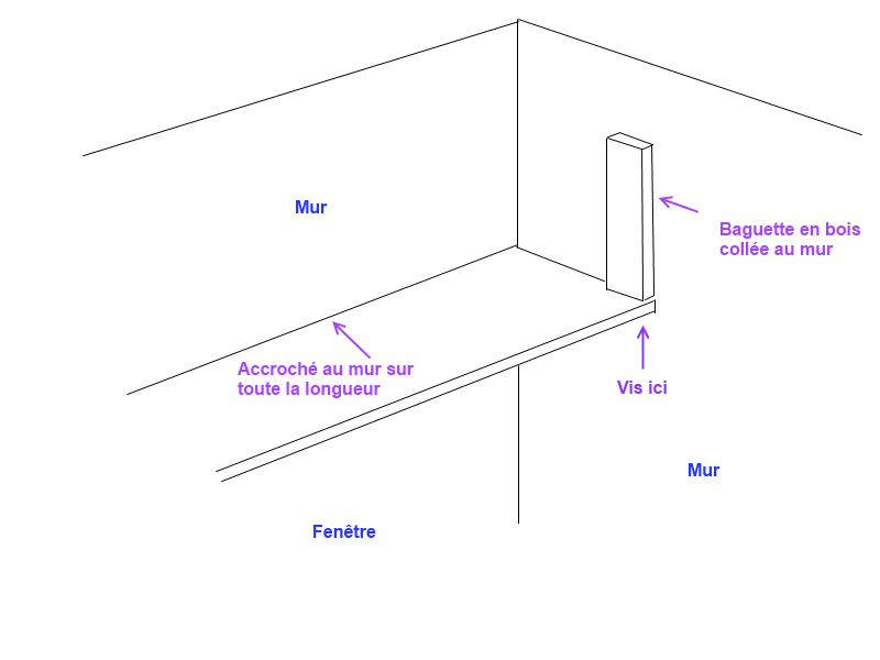 Sur cette photo (totalement floue) on voit (à peine) que j'ai retiré la face avant du coffre. Le fond, qui s'est donc affaissé, semble être accroché au-dessus de la porte-fenêtre sur son grand côté, et il est traversé de chaque côté par une vis qui vient s'enfoncer dans une baguette de bois collée au mur (on en voit qu'une sur la photo mais c'est identique de l'autre côté). Comme ça n'est pas forcément limpide et que je ne résiste pas à vous montrer mes talents sous Paint, voilà un schéma équivalent à la photo :