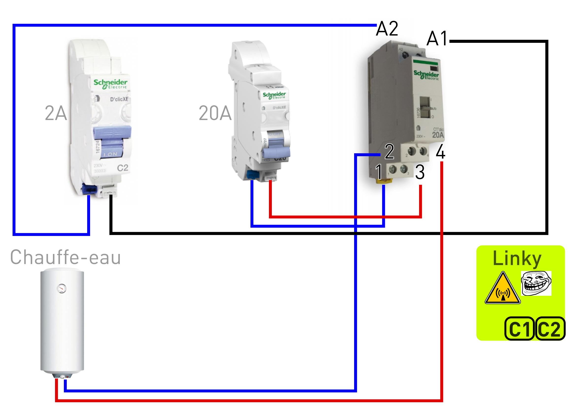 Sur le premier schéma, les photos correspondent à ce que tu as vraiment ? Parce qu'il n'y a aucun élément qui détecte les heures creuses dessus, donc quel que soit le câblage, ça ne peut pas marcher.