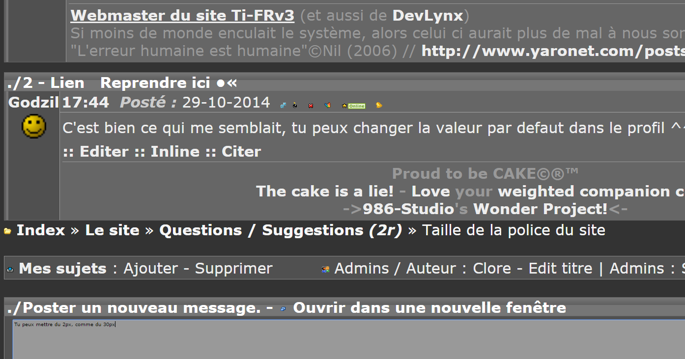 bien que ce ne soit pas la taille qui compte, ça serait possible d'avoir une police de taille par défaut plus grande ? ou pouvoir paramétrer ça dans le profil ? Je sais pas pour vous, mais sur mon écran hd, une minuscule mesure 1 mm de haut, c'est quand même pas beaucoup